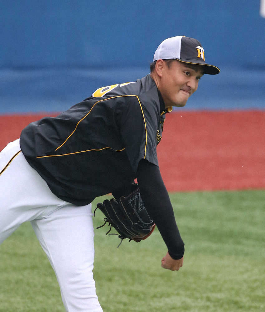 <D・神>試合前、キャッチボールをする秋山(撮影・坂田 高浩)