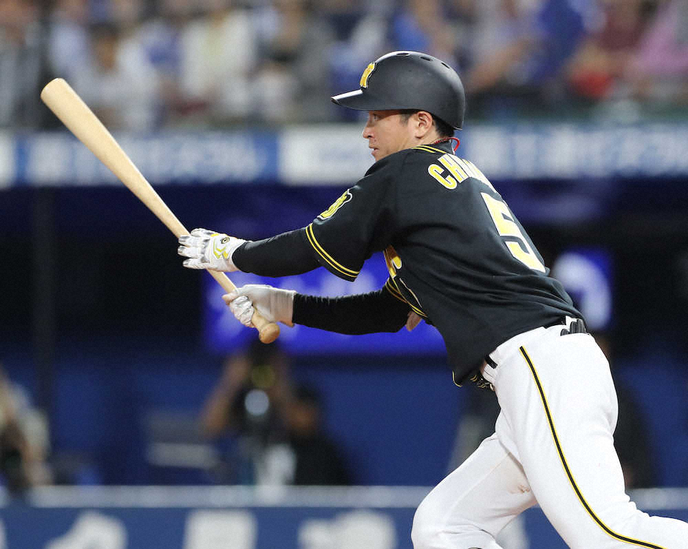 6回2死一塁、近本は中前打を放つ(撮影・大森 寛明)
