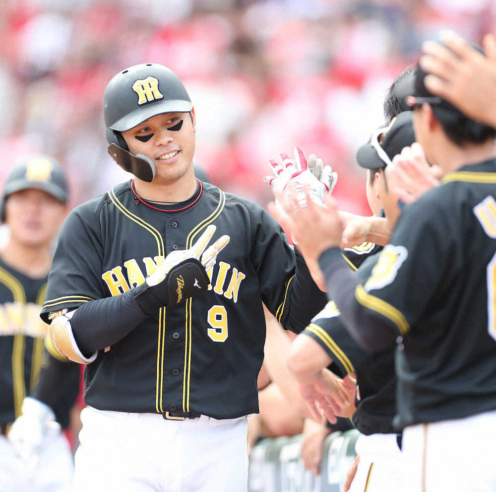 <広・神>3回1死一、三塁、右中間に3ランを放ち、ナインとタッチをかわす高山(撮影・坂田 高浩)