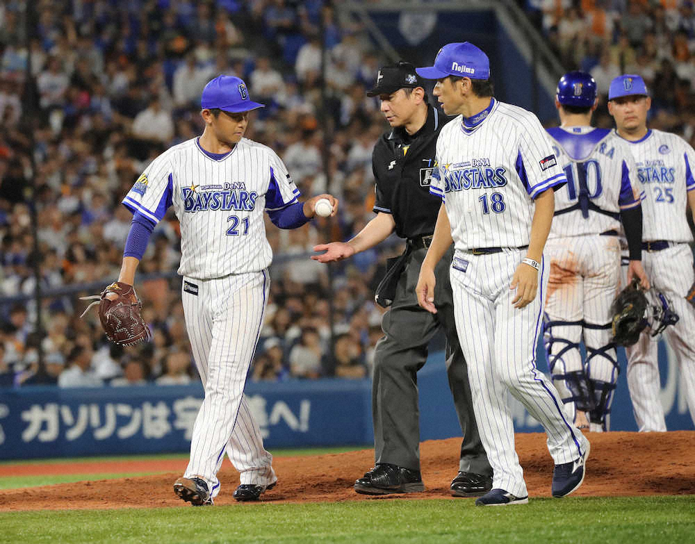 <D・巨>7回、治療のため、ベンチへ引き上げる今永(左)(撮影・吉田 剛)