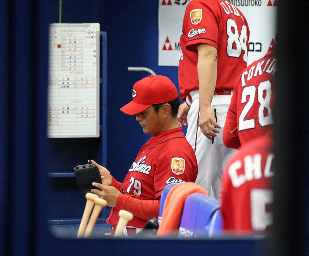 <D・広>ベンチでメモを取る緒方監督  (撮影・大塚 徹)