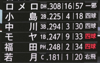 しかし4回に突然制球を乱し、4連続四球で2失点。先頭の吉田正に左前打を打たれると、1死後に小島、中川を連続で歩かせて1死満塁のピンチ。続くモヤにはフルカウントから8球目のフォークがワンバウンドとなって押し出し四球で失点すると、代打・福田にも連続で押し出し四球を与え、2―3と1点差に迫られた。