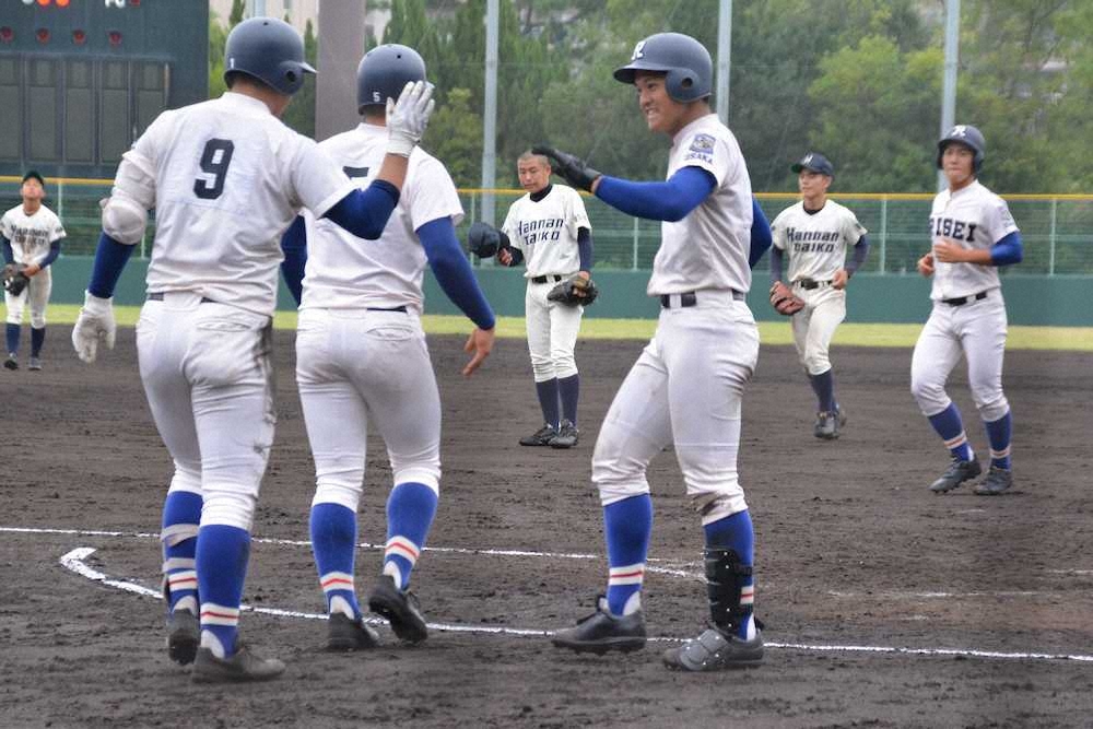 <履正社・阪南大高>履正社・関本(中央)は5回コールド勝ちを決める2ランを放ちナインとハイタッチ