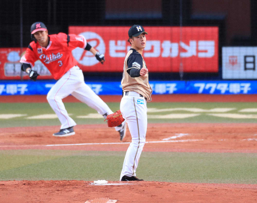 <ロ・日24>初回2死満塁で中村奨にすっぽぬけの死球を与えてしまう日本ハム先発の吉田輝(撮影・長久保 豊)
