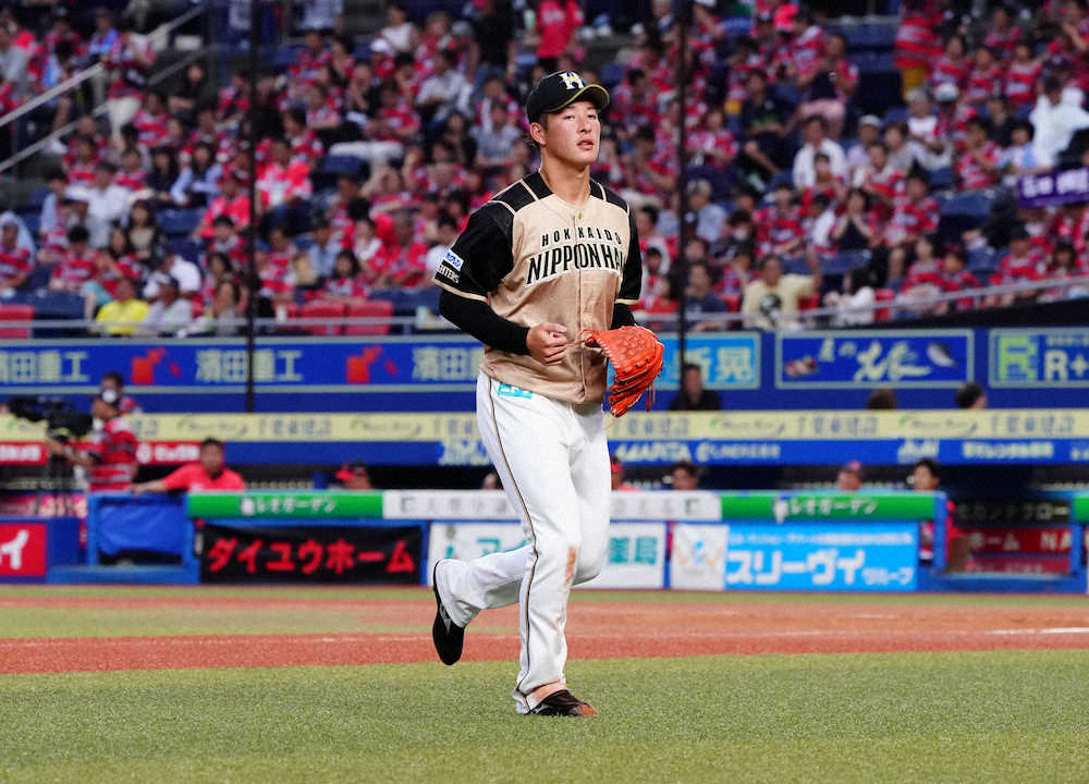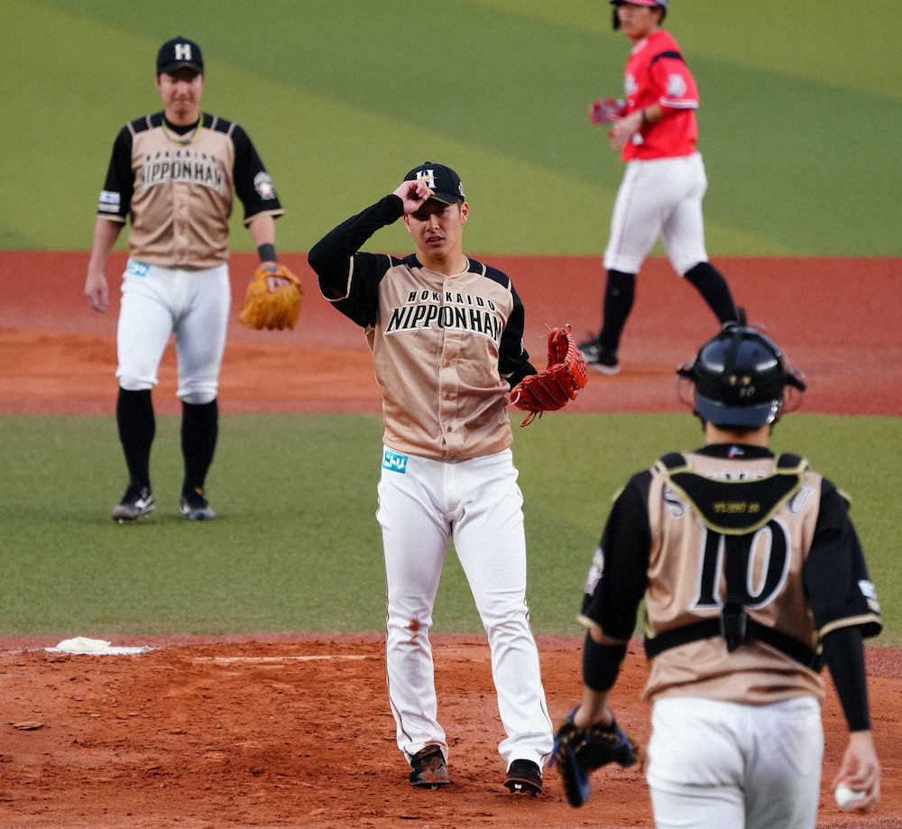 <ロ・日24>初回1死満塁、角中に適時打を許し汗を拭う吉田輝星(撮影・白鳥 佳樹)