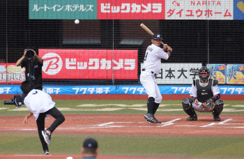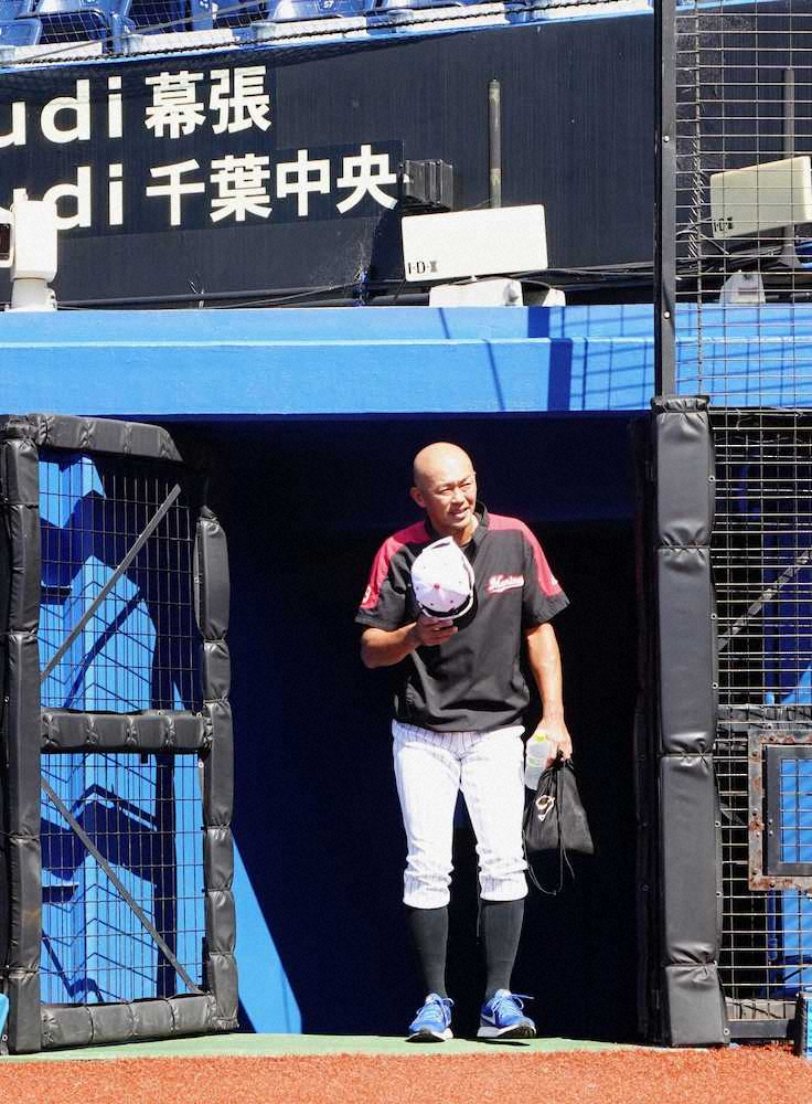 <ロ・日25>自らの記念Tシャツで打撃練習に臨む福浦(撮影・大塚 徹)