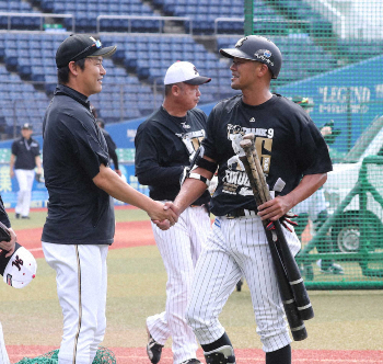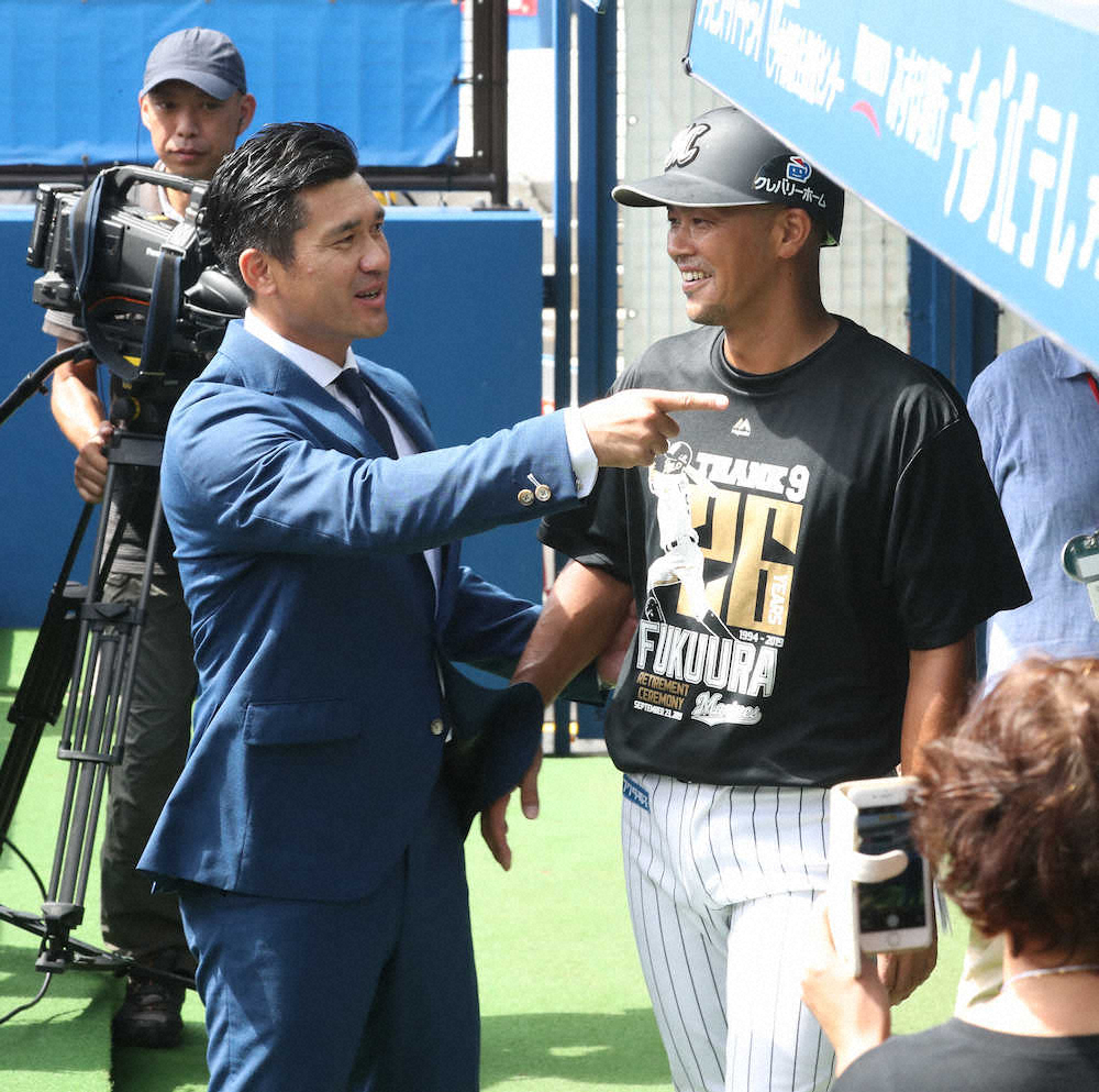 <ロ・日25>試合前、黒木知宏氏(左)と談笑する福浦(撮影・大塚 徹)