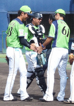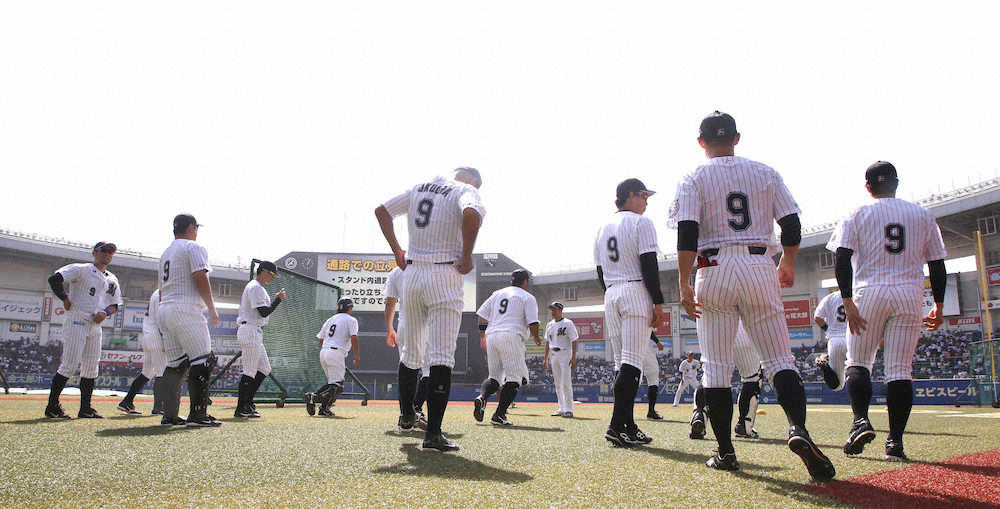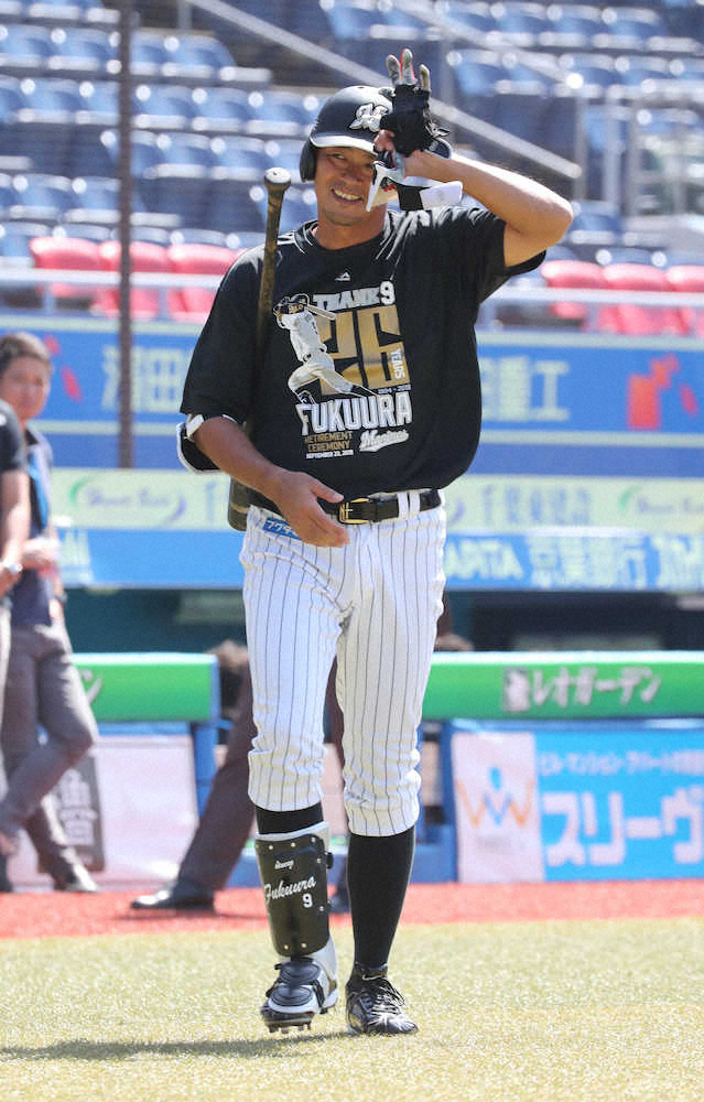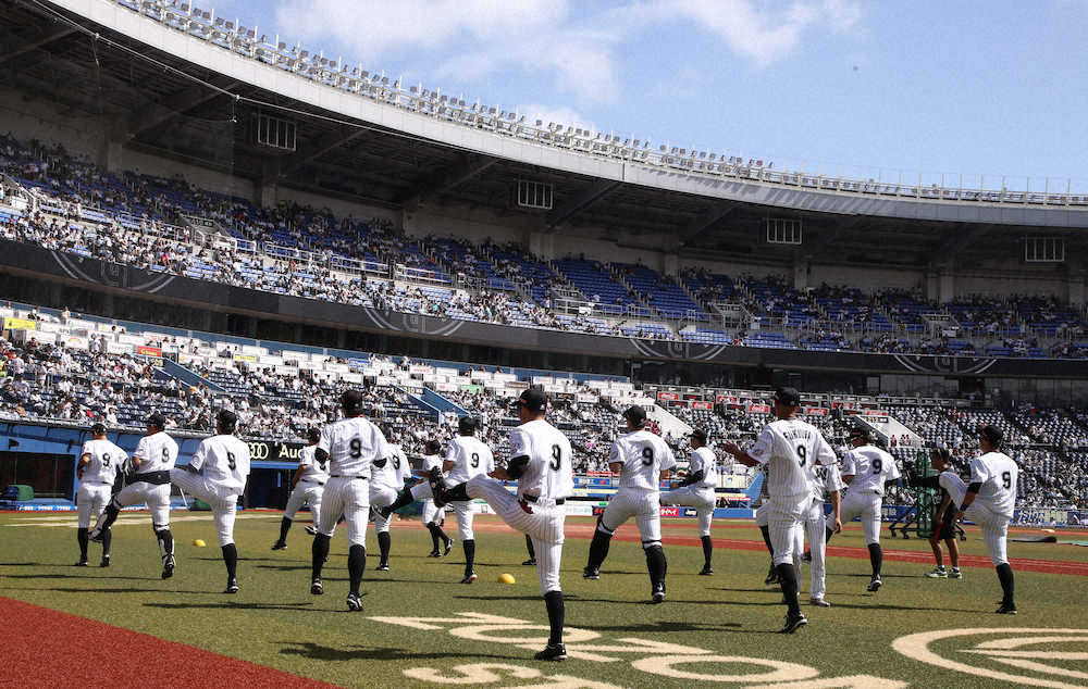 <ロ・日25>背番号9に囲まれアップする福浦(撮影・長久保 豊)