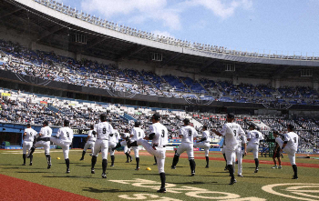 <ロ・日25>引退試合で次男と始球式に臨んだ福浦(撮影・大塚 徹)