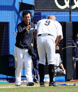 <ロ・日25>福浦からあいさつを受ける栗山監督(撮影・長久保 豊)