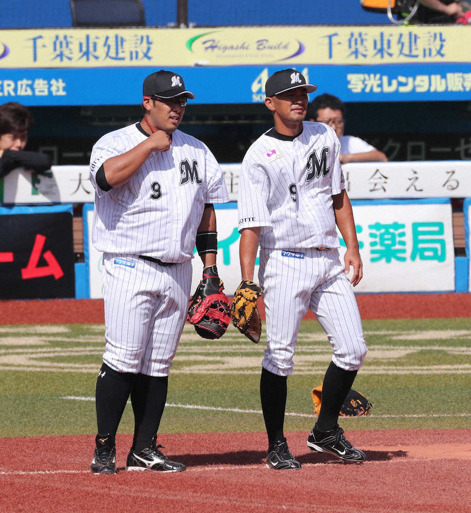 <ロ・日25>同じ番号9で一塁の守備位置に就く井上(左)と福浦(撮影・大塚 徹)