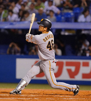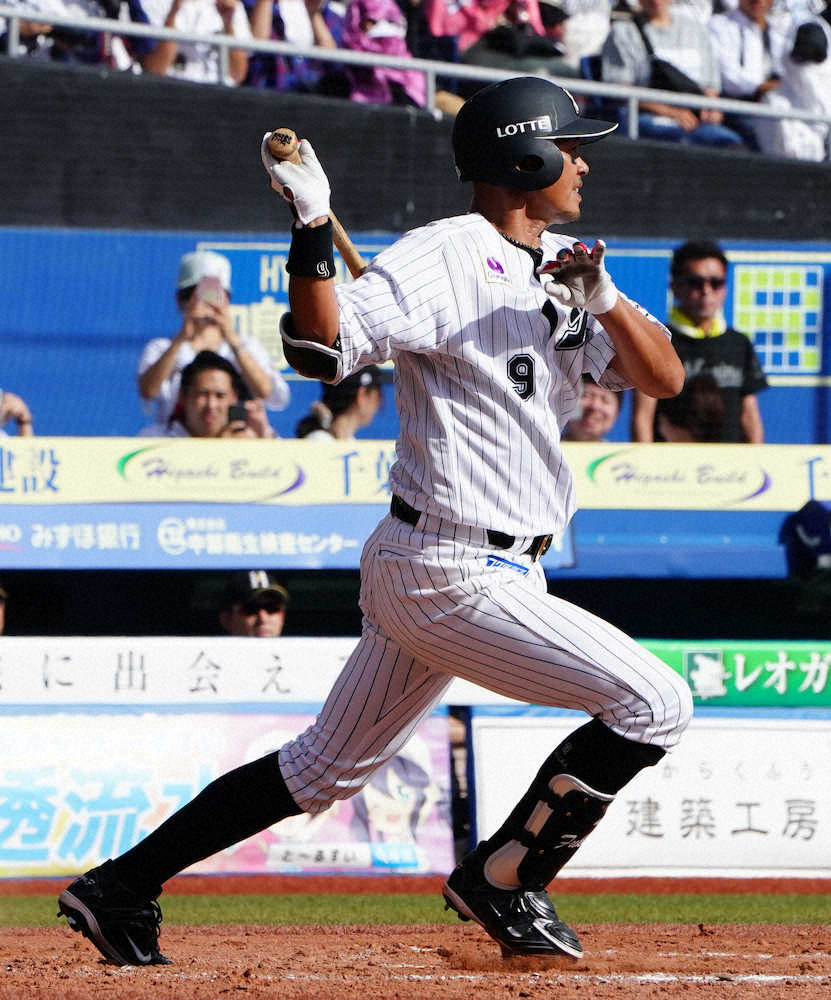 <ロ・日25>7番DHスタメンの福浦。スタンドではロッテファンが「9」のボードを掲げた(撮影・大塚 徹)