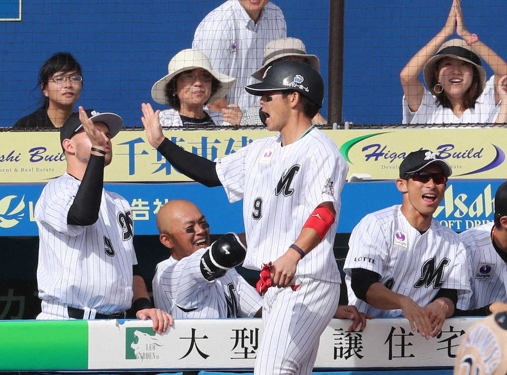 <ロ・日25>初回無死一、二塁、井上の左翼への適時安打で生還した鈴木を迎える福浦(撮影・大塚 徹)