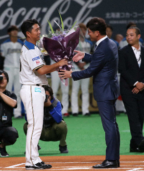 <日・オ>試合前の引退セレモニー、建山氏から花束が実松育成コーチ兼捕手に贈呈された(撮影・高橋茂夫) Photo by スポニチ 日本ハム・実松「21年間プロにいられた…それを自信に」 引退セレモニーに… ギャラリーで見る この記事のフォト 2019年09月26日の画像一覧 もっと見る 2019年09月26日の画像をもっと見る