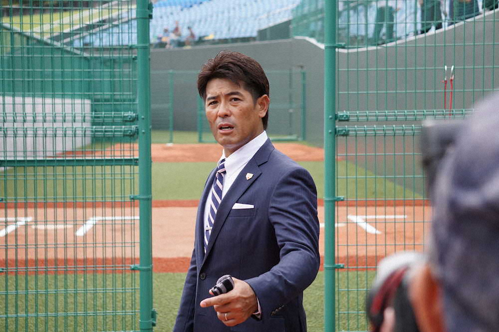 五輪開幕戦を行うあづま球場の新装ブルペンを視察する侍ジャパン・稲葉監督