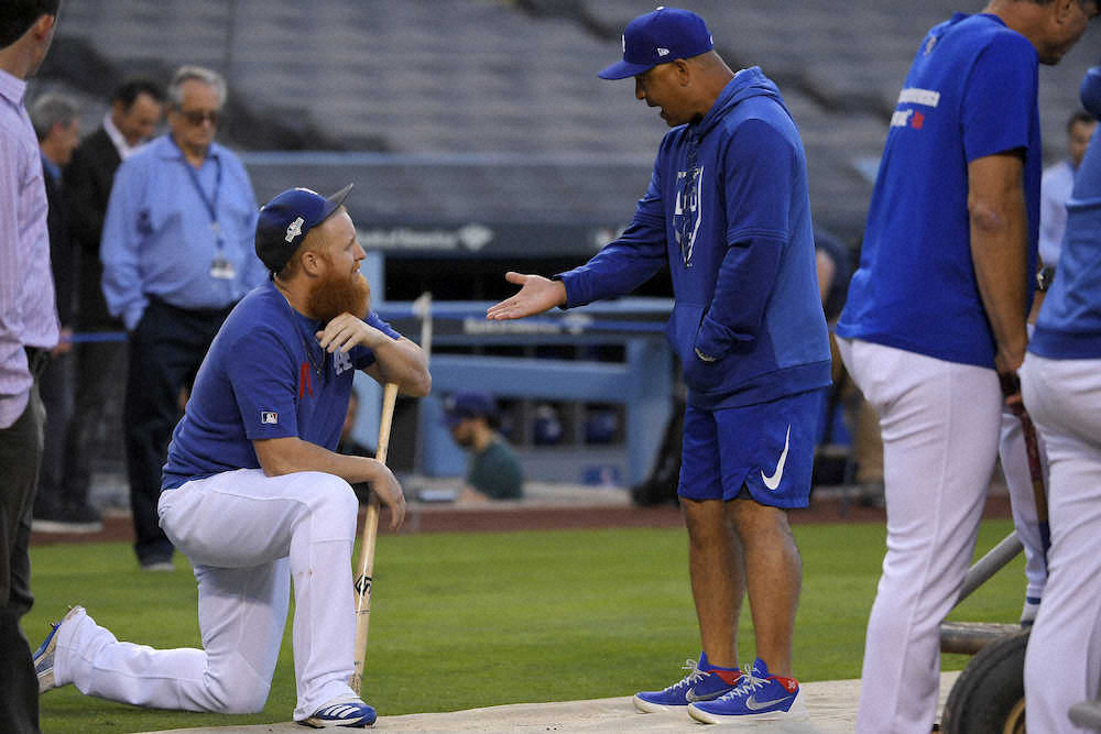 シート打撃に参加したジャスティン・ターナー内野手(左)と話すデーブ・ロバーツ監督(AP)