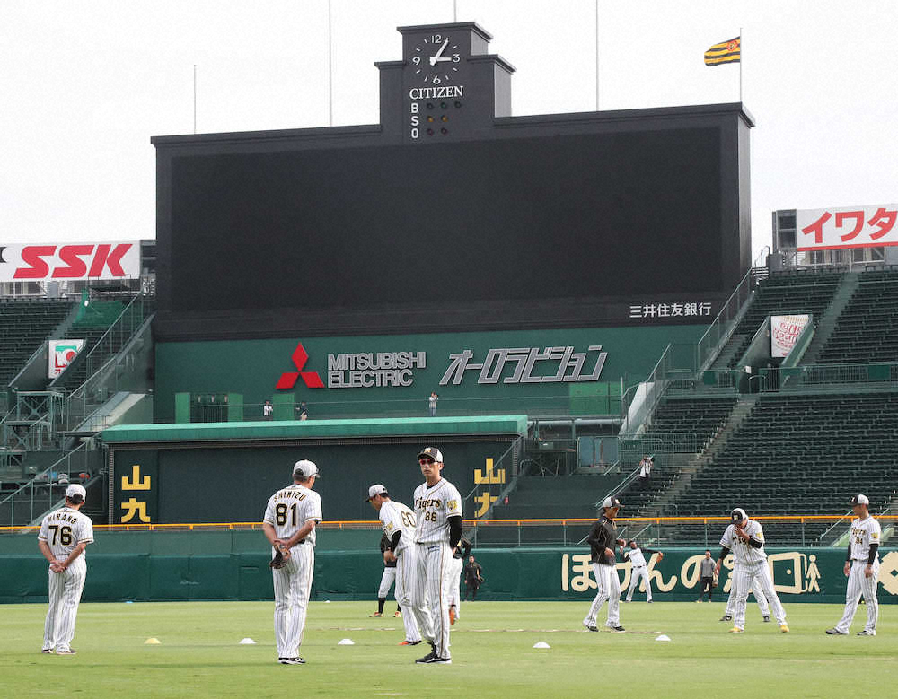 練習開始のずいぶん前に記者席に座ってみた。甲子園は静かだった。無人の球場に姿を見せたのは最初、阪神園芸のグラウンドキーパーたち、次いでウオームアップの準備のため、トレーニングコーチ・伊藤敦規が姿を見せた。この後、選手たちは三々五々、一礼してグラウンドに飛び出していく。