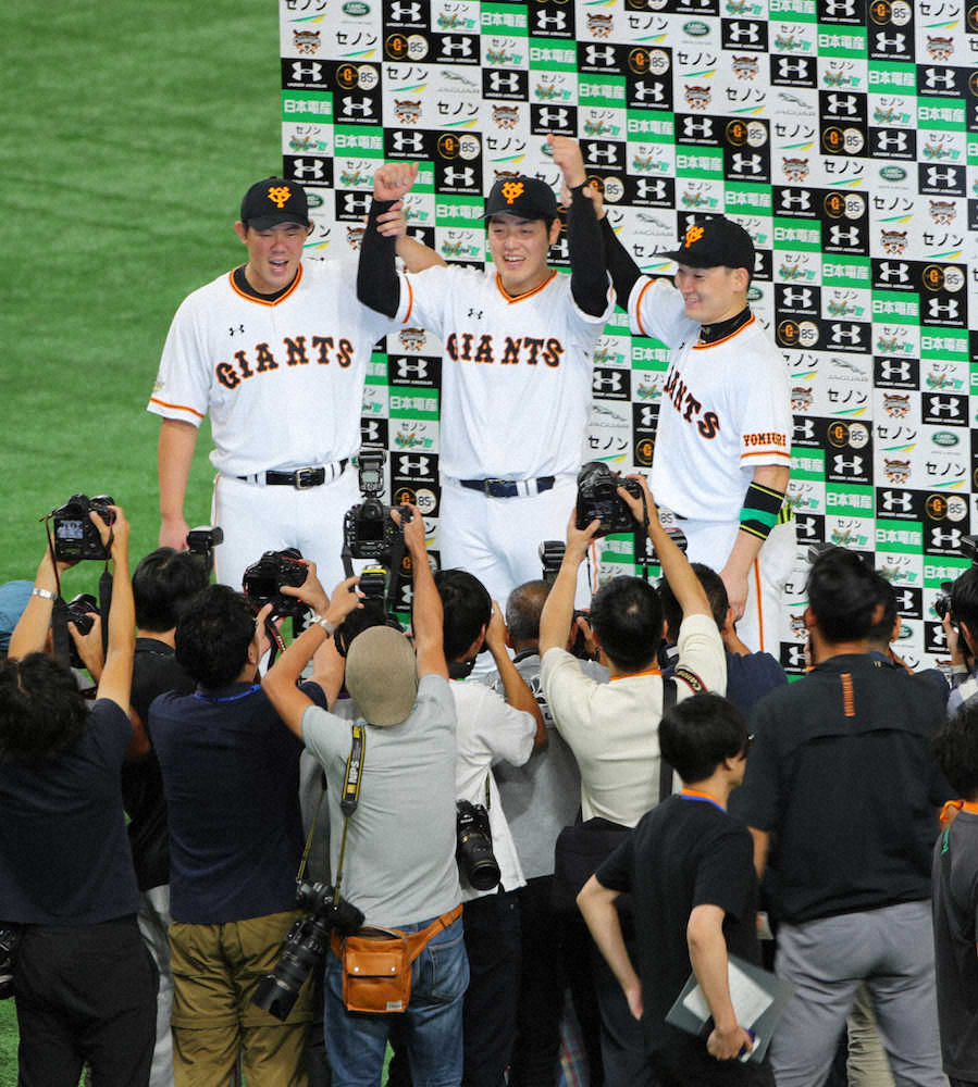<CSファイナル 巨・神>ヒーローインタビューで笑顔を見せる(左から)山口、岡本、丸(撮影・木村 揚輔)