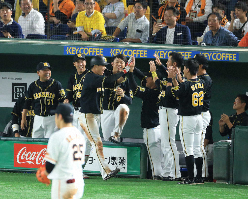 セCSファイナルS<巨・神3>9回無死、大山は右越えにソロを放ち出迎えを受ける(撮影・西尾 大助)