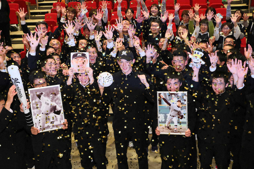 ロッテが交渉権を獲得し、昭和の怪物・江川卓、平成の怪物・松坂大輔の写真などを持った部員、保護者らと笑顔を見せる令和の怪物・大船渡の佐々木(中央)=撮影・木村 揚輔