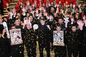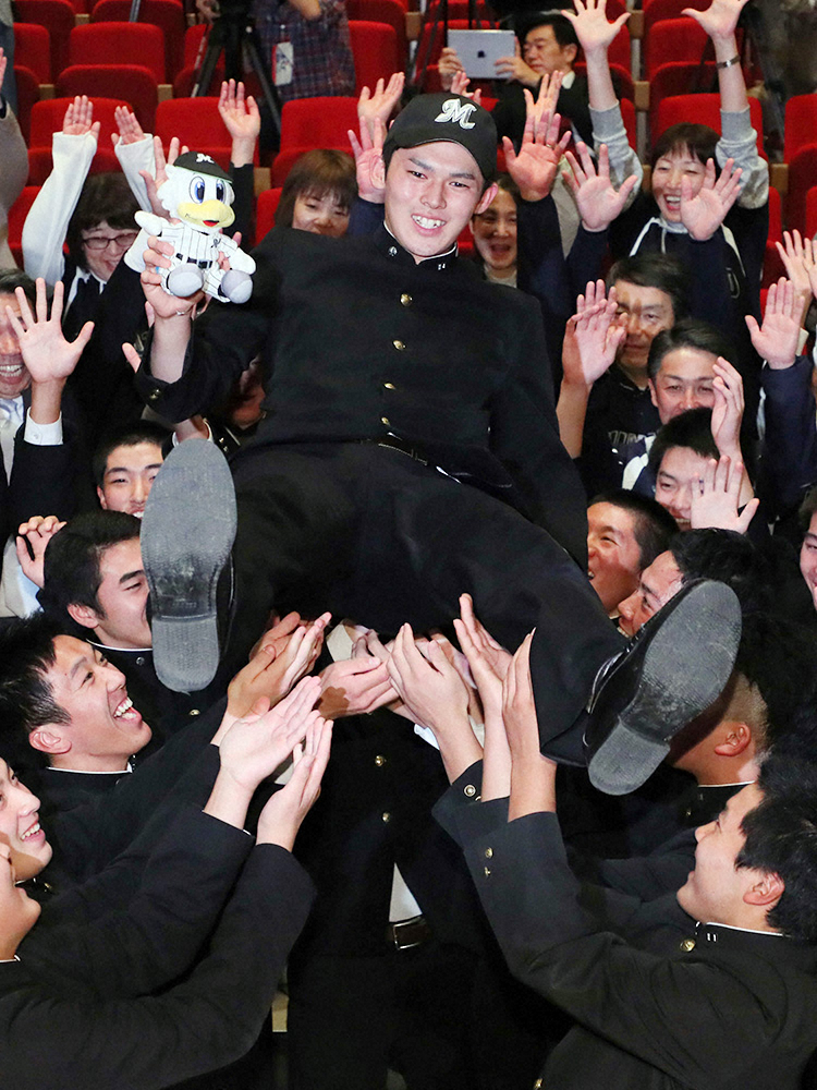 ロッテに1位指名され、昭和の怪物・江川卓、平成の怪物・松坂大輔の写真を持った部員、保護者らと笑顔を見せる大船渡の佐々木(中央)=撮影・木村 揚輔 Photo by スポニチ 佐々木はロッテ! 井口監督引いた、最多4球団競合「日本一の投手になりたい」 ギャラリーで見る この記事のフォト 2019年10月18日の画像一覧 もっと見る 2019年10月18日の画像をもっと見る