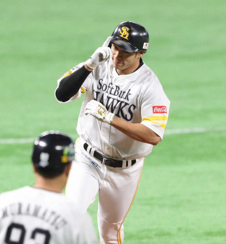 <日本シリーズ ソ・巨>8回1死、左越えソロの柳田はポーズを決めながらダイアモンドをまわる(撮影・大森 寛明)