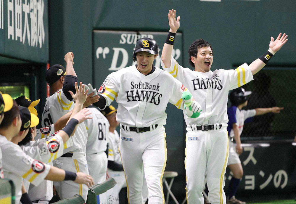 <日本シリーズ ソ・巨>8回1死、ソロを放った柳田はナインの出迎えを受ける(右は松田宣)(撮影・岡田 丈靖)