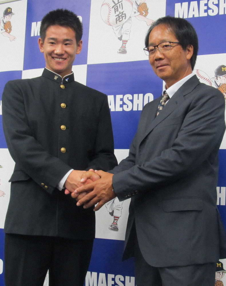 巨人の内田スカウト(右)と握手を交わすドラフト4位・井上