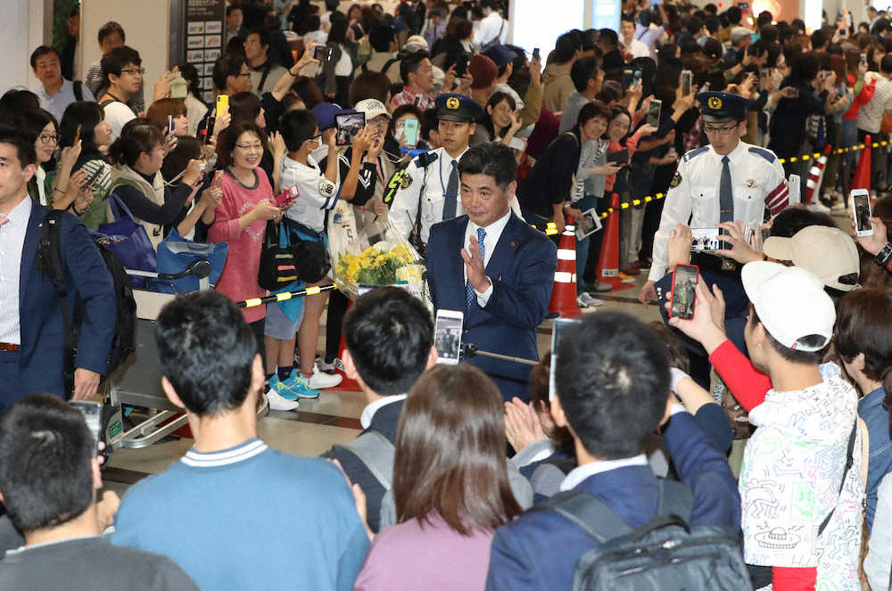 日本一から一夜明け、福岡空港に到着した工藤監督は大勢のファンから祝福される(撮影・岡田 丈靖)