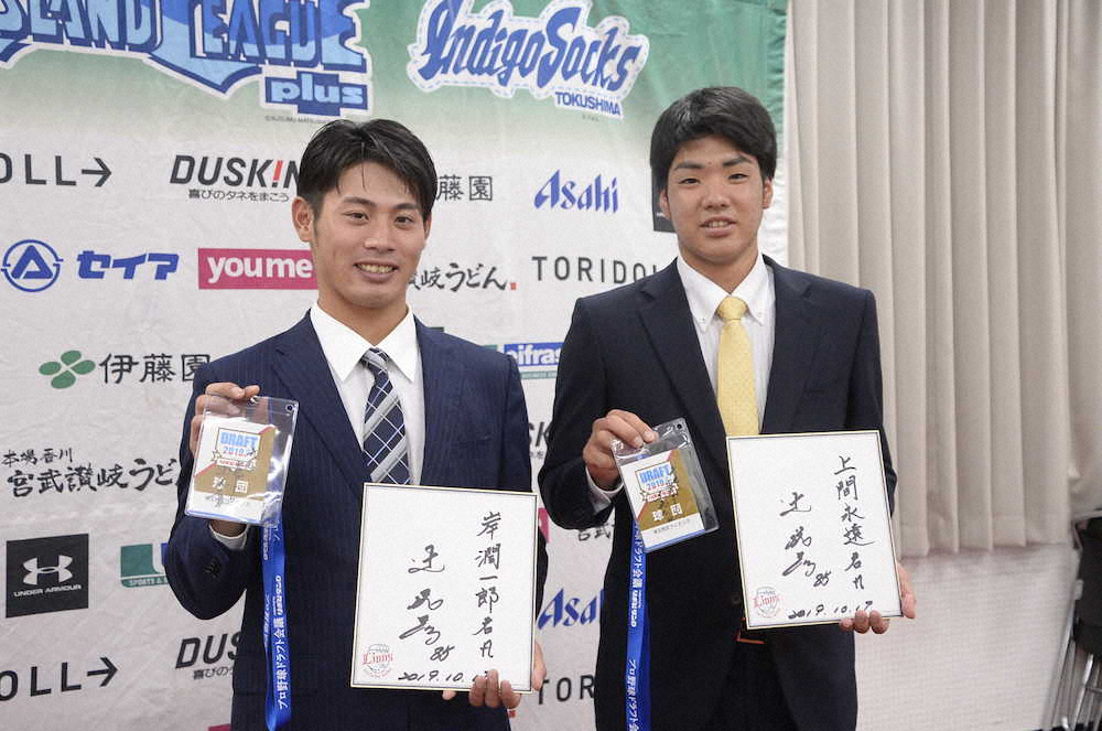 西武は25日、ドラフト7位で指名した上間永遠投手(18)、8位で指名した岸潤一郎外野手(22=ともに四国アイランドリーグplus徳島)に徳島市内で指名あいさつを行った。