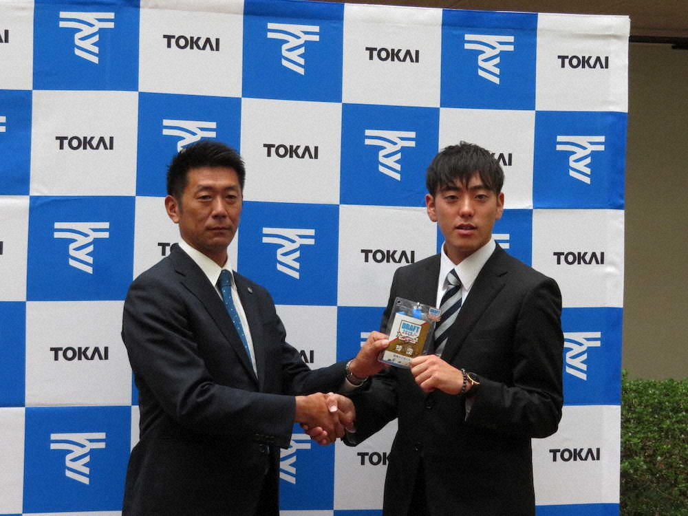 指名あいさつを受けた阪神ドラフト6位の東海大九州キャンパス・小川(右)
