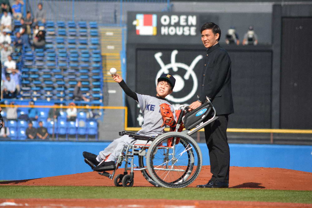早慶戦の試合前に始球式が行われた。慶大が長期療養を必要とする児童をチームに受け入れるプロジェクトで慶大野球部の練習に参加してきた田村勇志くん(11)。車いすに乗り、慶大のユニホームで神宮のグラウンドに立った。思い切り腕を振って白球を投じると、場内からは大きな拍手がわき起こった。ベンチ前では慶大メンバーが花道を作って迎え入れ、ハイタッチを交わした。「思い切って投げられたので良かった。人が想像以上に多くてめっちゃ緊張しました」と満面の笑みで振り返った。