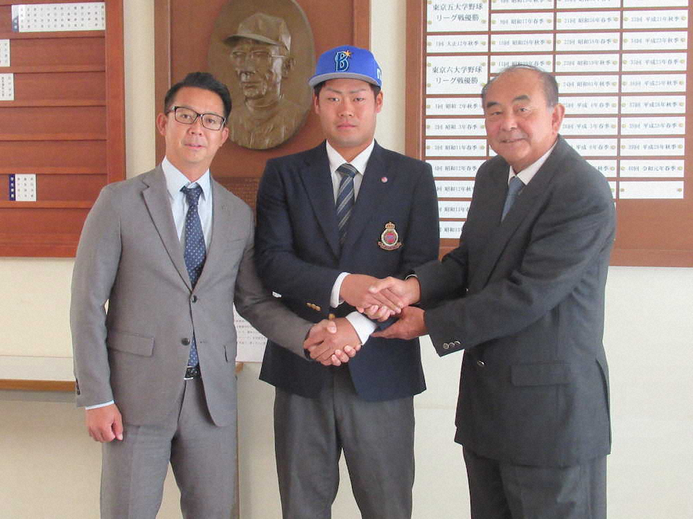 DeNAからドラフト3位指名された伊勢(中央)は八馬スカウト(左)と吉田スカウト部長から指名あいさつを受け、ガッチリ握手