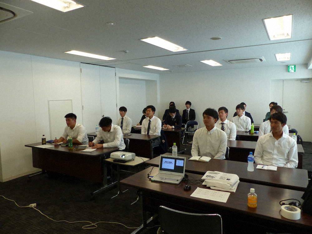 広島からドラフト1位指名された明大・森下や同2位の法大・宇草、楽天3位の慶大・津留崎、中日4位の郡司ら8選手に加え、職員としてプロ球界に進む計11人が出席。公認会計士や弁護士による約2時間の講習では賭博、薬物問題なども取り上げられ、プロ、社会人としての在り方を学んだ。