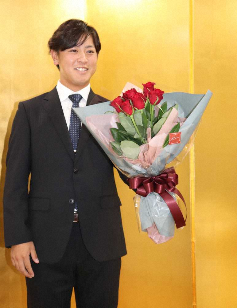 愛を約束する花を手に、日本ハムで活躍していく誓いを立てた節目の日。上限の契約金1億円で合意したドラフト1位の選手として「高い評価をしていただいたので、即戦力でチームに貢献したい。一日も早く1軍の舞台で頑張っていきたい」と口にした。1年目の新人王という照準を、10月17日のドラフト当日から見据えていた。この日は、そこに至るまでの道を描いた。