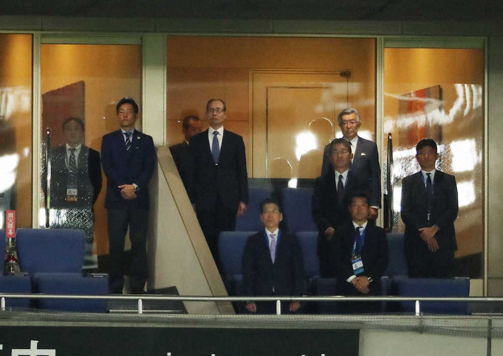 国歌斉唱で起立するソフトバンクの王会長(中央)(撮影・木村 揚輔)