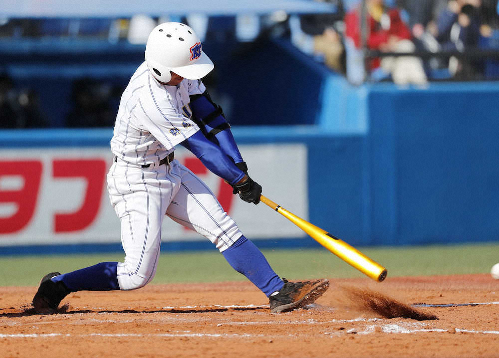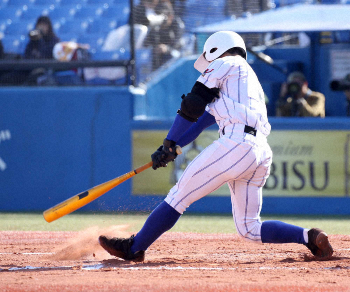 白樺学園戦の7回、左前に決勝打を放つ高崎健康福祉大高崎・山畑