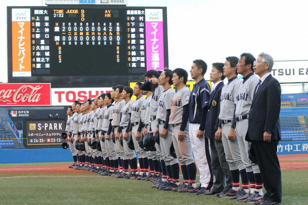 関大は悲願の優勝はならなかった。打線が7回までパーフェクトに封じられ、投手陣も終盤に力尽きた。早瀬万豊監督は「完敗です。もっと競ったゲームがしたかったが、できなくて残念」と振り返った。