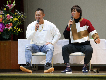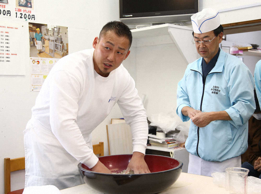 初体験したそば打ちでは、桑田・清原のPL学園に84年センバツで7―18で敗れた砂川北(現砂川)の8番打者だった大内卓さん(53)が先生役。素人そば打ち5段の腕前の大内さんから「麺棒の転がし方がうまい」と褒められた。生地を伸ばす麺棒の素材はイチイの木。そば打ちスタッフから「来季は1位で!」と激励された。
