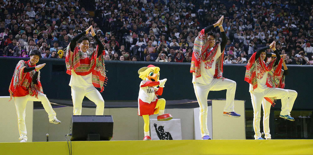 <ソフトバンクファンフェスタ>ファンを前にパプリカの踊りを披露する(左から)甲斐野、高橋礼、椎野、周東、栗原(撮影・岡田 丈靖) Photo by スポニチ ソフトB 高橋礼ら若手5人でパプリカダンス!栗原「出来は80点」 ギャラリーで見る この記事のフォト 2019年11月24日の画像一覧 もっと見る 2019年11月24日の画像をもっと見る