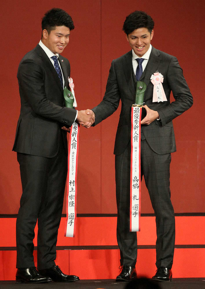 新人王を受賞し、ポーズをとるヤクルト・村上(左)とソフトバンク・高橋礼 Photo by 共同 新人王はセがヤクルト・村上 阪神・近本に39票差 パはソフトB・高橋礼に… ギャラリーで見る この記事のフォト 2019年11月26日の画像一覧 もっと見る 2019年11月26日の画像をもっと見る