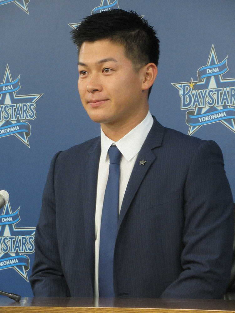 契約を更改し、会見するDeNA・柴田