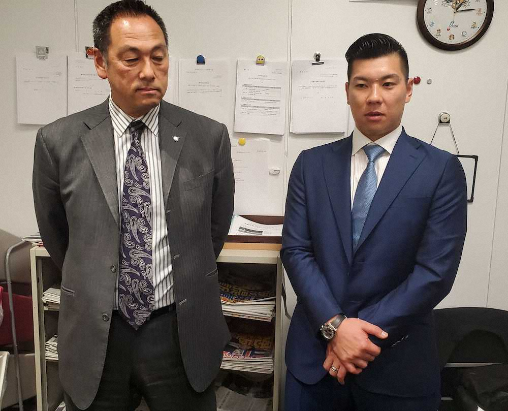 事務折衝に出席した日本プロ野球選手会の炭谷銀仁朗会長(右)と森忠仁事務局長