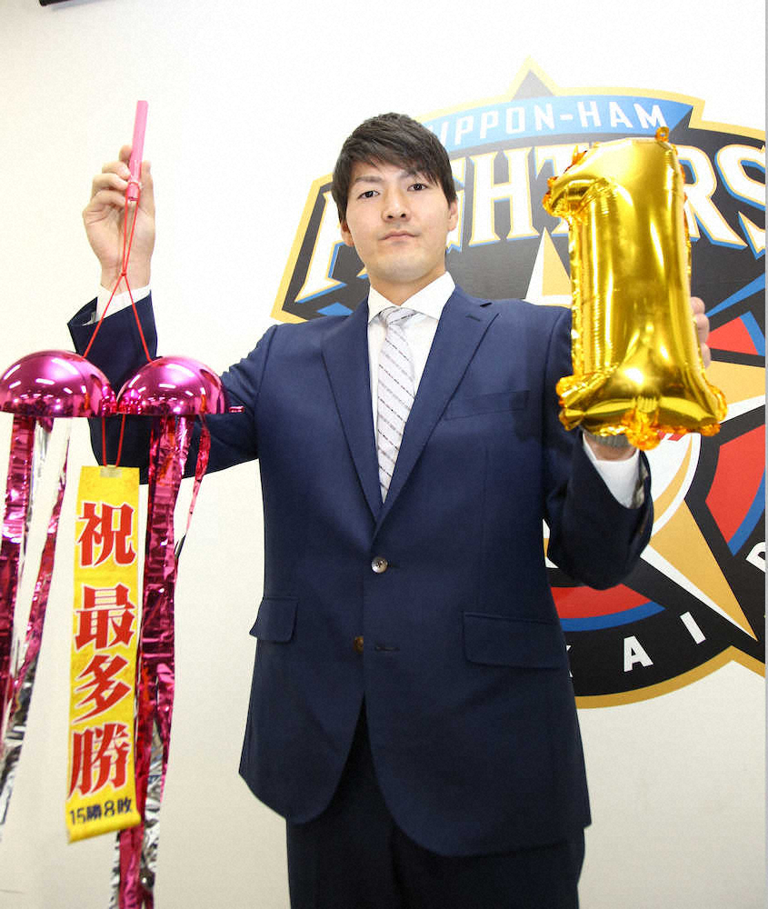 会見後、来季は1番になると1の数字のバルーンと最多勝を祝ったくす玉を持ってポーズする有原(撮影・高橋茂夫)