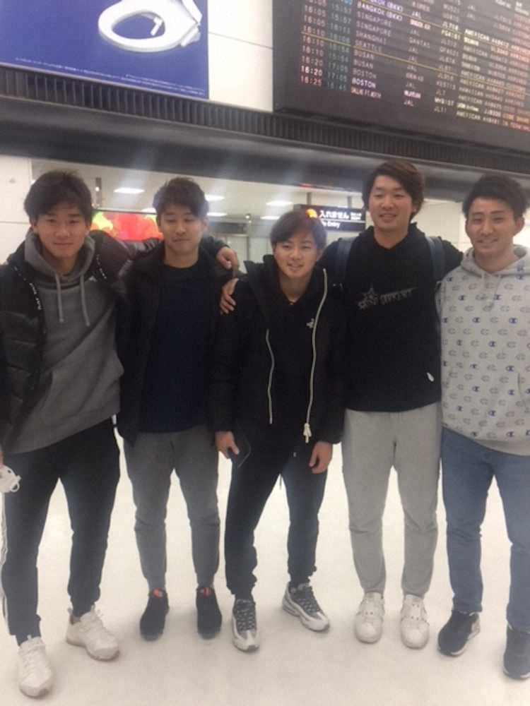 シアトルから帰国したロッテの5投手。左から中村稔、種市、成田、二木、小島