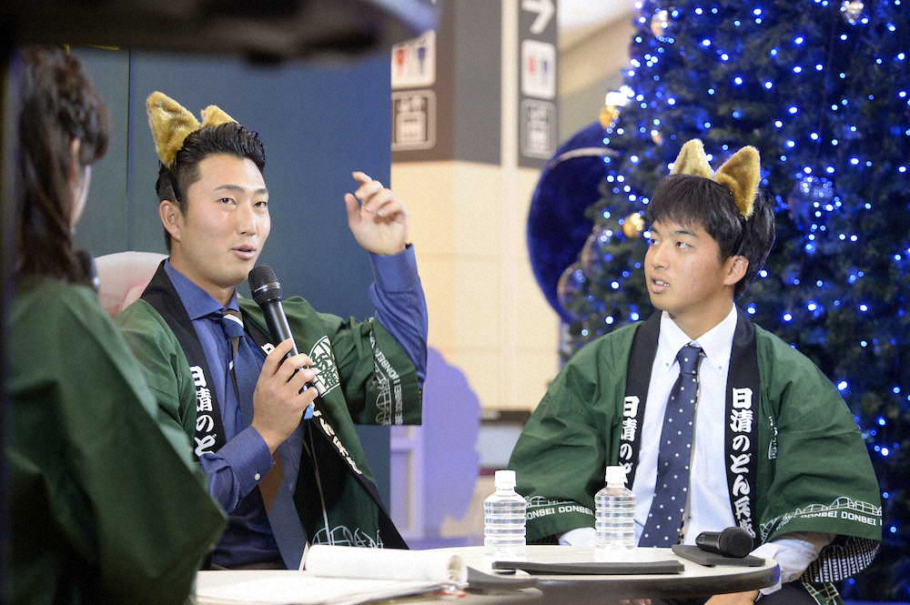 トークショーでどんぎつねの耳を着用した藤嶋健人(左)、山本拓実