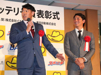 山口は今季リーグ最多15勝を挙げ、最多奪三振、勝率1位の3部門でトップ。「本当に一番嬉しい賞。6月から(小林)誠司と狙っていこう、と話していた。1人じゃできない、キャッチャーがいての自分」とお互いを称え合った。