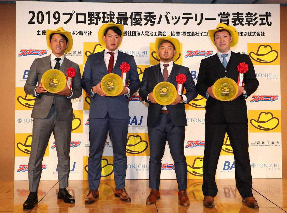 <2019プロ野球最優秀バッテリー賞>最優秀バッテリー賞を受賞した(左から)巨人・小林、山口、西武・森、増田(撮影・村上 大輔)