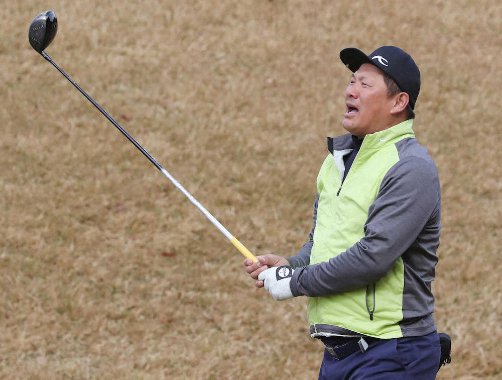 <山崎武司チャリティーゴルフ>ティーショットを放ち、ボールの行方を見つめる山崎武司氏(撮影・椎名 航)