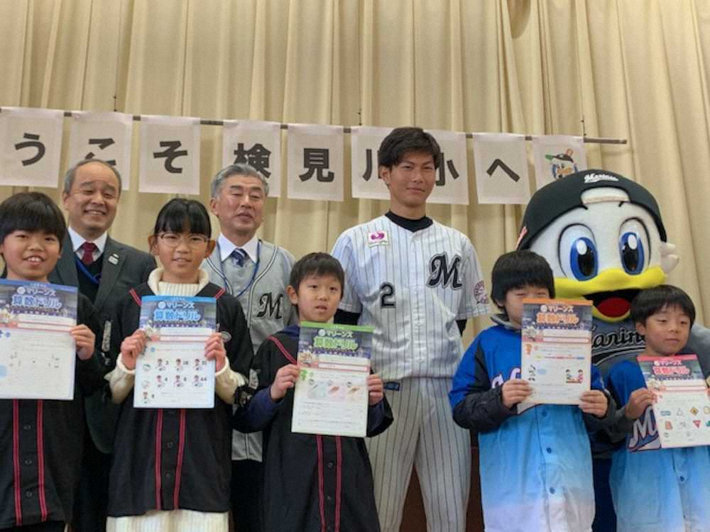 検見川小学校を訪れ「マリーンズ算数ドリル」(令和元年冬号)をプレゼントしたロッテ・藤原